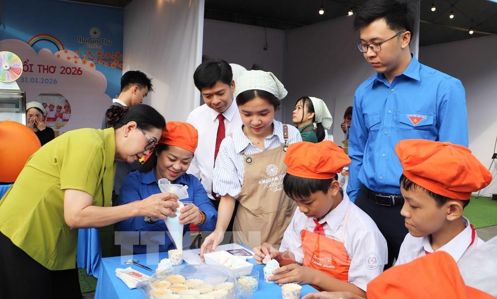Các em thiếu nhi trải nghiệm làm bánh tại chương trình. Ảnh: Hồng Thái - TTXVN