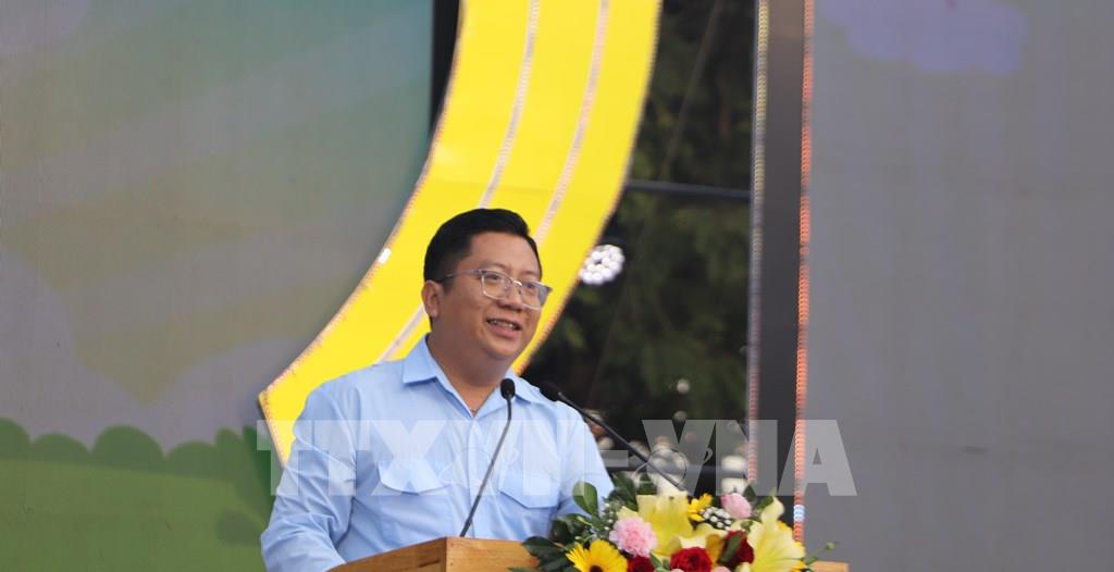 Anh Trần Việt Tuấn, Phó Bí thư Thành đoàn, Chủ tịch Hội đồng Đội thành phố Cần Thơ, phát biểu tại chương trình. Ảnh: Hồng Thái - TTXVN