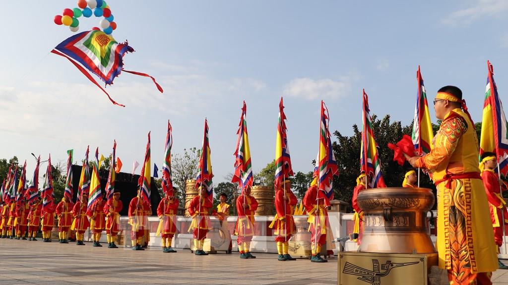 Lá đại kỳ ngũ sắc tạo điểm nhấn tại Đền thờ Vua Hùng trong ngày Giỗ Tổ. Ảnh: Nguyễn Hằng - TTXVN