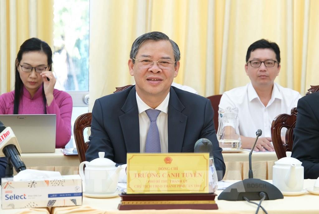 Chủ tịch UBND thành phố Cần Thơ Trương Cảnh Tuyên thông tin các dự án thu hút đầu tư của thành phố với Đoàn công tác Tập đoàn Sumitomo. Ảnh: Thanh Liêm - TTXVN