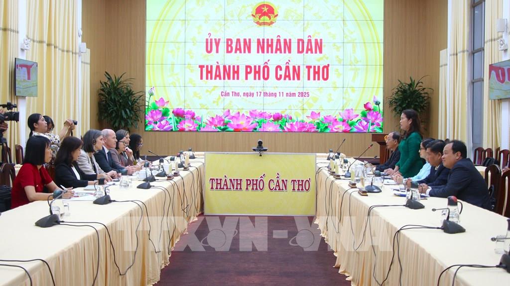 Bà Nguyễn Thị Ngọc Điệp, Phó Chủ tịch UBND thành phố Cần Thơ tiếp và làm việc với đoàn. Ảnh: Nguyễn Hằng - TTXVN