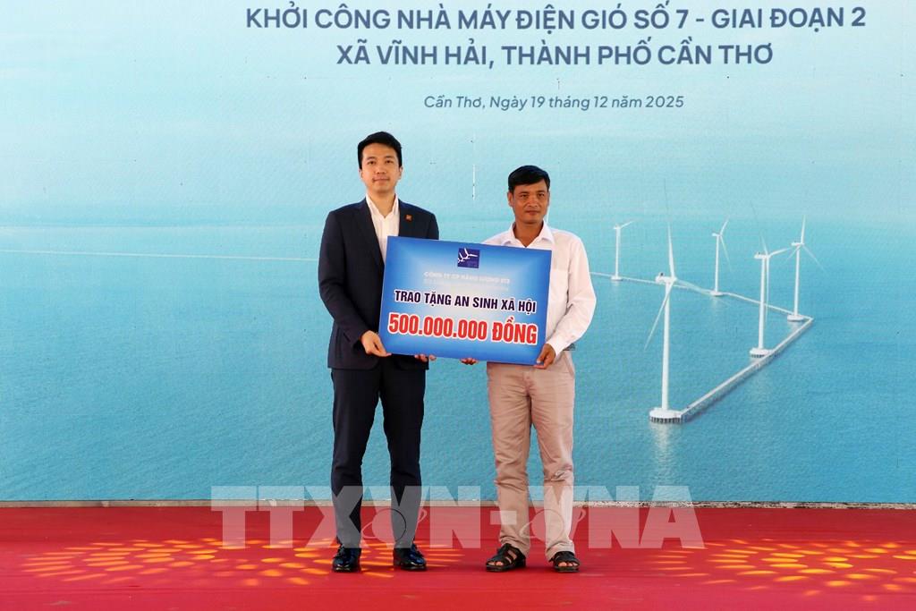 Chủ đầu tư Dự án trao ủng hộ Quỹ An sinh xã hội địa phương. Ảnh: Trung Kiên - TTXVN
