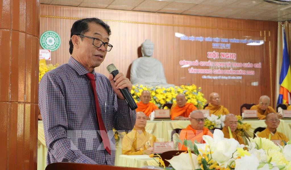 Đại diện chư Tăng, Ni được tấn phong Giáo phẩm, Hòa thượng Thích Phước Thành, Phó Trưởng ban Thường trực Ban Trị sự Giáo hội Phật giáo Việt Nam thành phố bày tỏ lòng tri ân các bậc Trưởng lão Hội đồng Chứng minh, Hội đồng Trị sự, chư tôn đức lãnh đạo Ban Thường trực Ban Trị sự Giáo hội Phật giáo Việt Nam thành phố và lãnh đạo thành phố; cho biết, thành phố luôn quan tâm, hỗ trợ, tạo điều kiện cho chư Tăng, Ni được thuận lợi hoạt động và hoàn thành các mặt công tác Phật sự, góp phần xây dựng đời sống văn hóa, văn minh, lan tỏa các giá trị nhân văn, củng cố khối đại đoàn kết toàn dân tộc, xây dựng thành phố Cần Thơ phát triển bền vững, xứng tầm là trung tâm động lực của vùng đồng bằng sông Cửu Long.