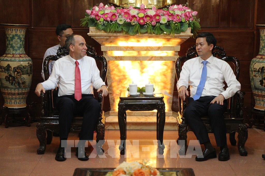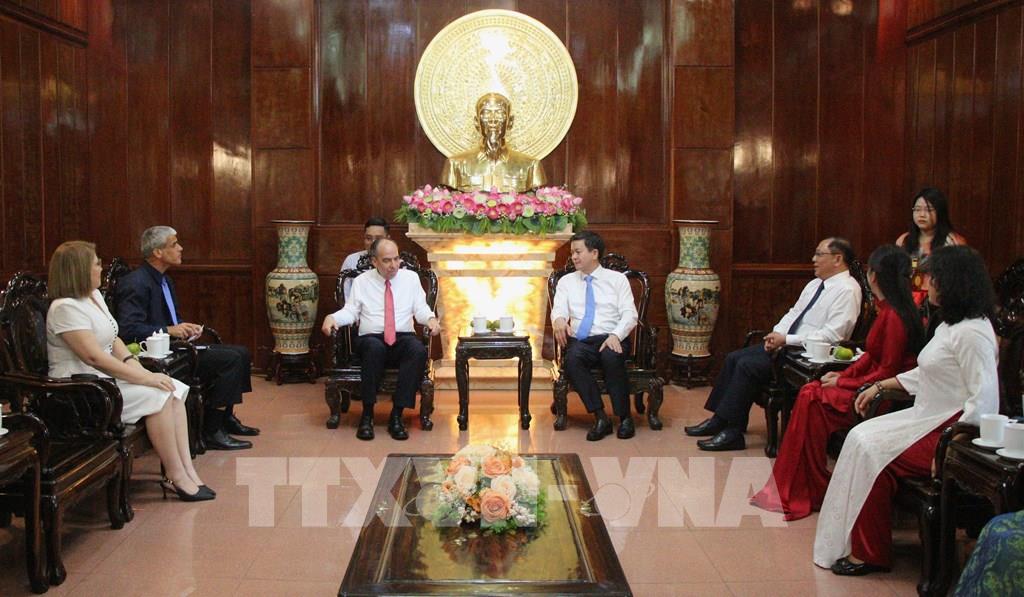 Đồng chí Rogelio Polanco Fuentes (trái), Đại sứ Cộng hòa Cuba tại Việt Nam, trao đổi cùng lãnh đạo thành phố. Ảnh: Nguyễn Hằng - TTXVN