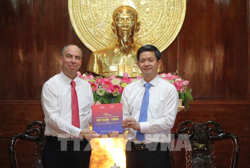 Đại sứ Cuba Rogelio Polanco Fuentes tặng Sách "65 năm vung đắp tình hữu nghị thủy chung, mẫu mực Việt Nam - Cuba" cho lãnh đạo thành phố Cần Thơ. Ảnh: Nguyễn Hằng - TTXVN