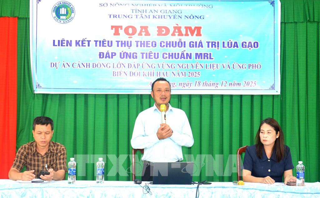 Sáng 18/12, tại xã Gò Quao, Trung tâm Khuyến nông An Giang tổ chức Toạ đàm Liên kết tiêu thụ theo chuỗi giá trị lúa gạo đáp ứng tiêu chuẩn giới hạn dư lượng tối đa (MRL) thuộc dự án Cánh đồng lớn đáng ứng vùng nguyên liệu và ứng phó với biến đổi khí hậu. Tham dự có trên 50 đại biểu là nông dân, hợp tác xã, ngành chuyên môn, chính quyền địa phương và doanh nghiệp thu mua chế biến lúa gạo xuất khẩu.