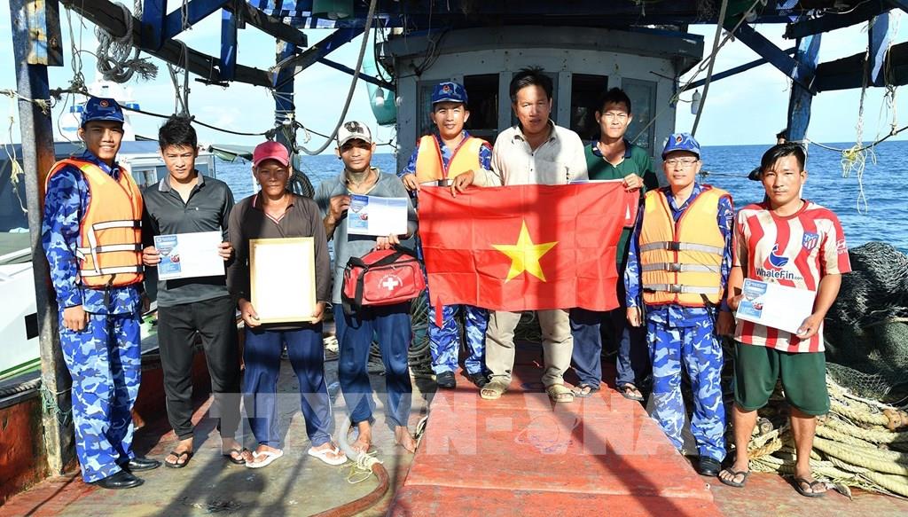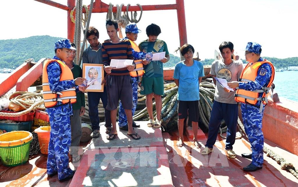 Vùng Cảnh sát biển 4 tặng cờ Tổ quốc, ảnh Bác Hồ cho ngư dân và phát tờ rơi tuyên truyền về khai thác IUU. Ảnh: TTXVN phát