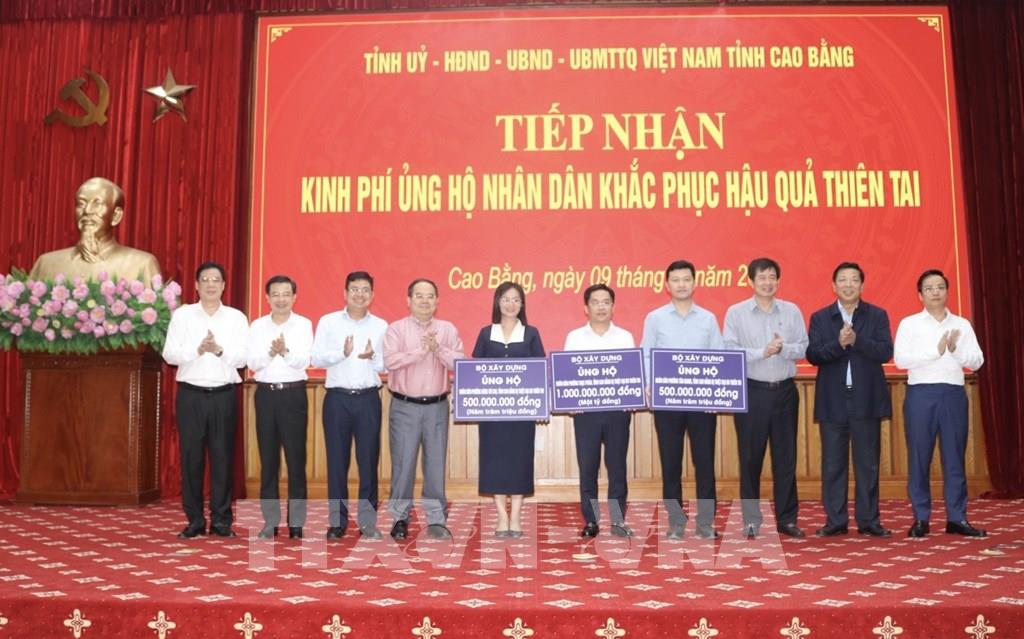 Công đoàn Xây dựng Việt Nam ủng hộ, hỗ trợ nhân dân tỉnh Cao Bằng khắc phục thiên tai. Ảnh: Chu Hiệu-TTXVN.