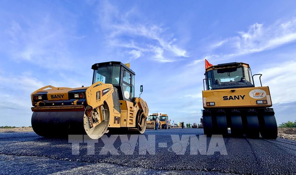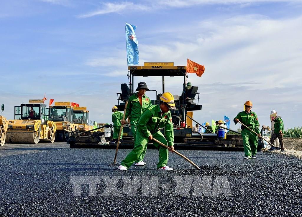 Thi công thảm bê tông nhựa trên tuyến chính cao tốc đoạn qua địa bàn phường Vĩnh Tế, tỉnh An Giang. Ảnh: Thanh Sang-TTXVN