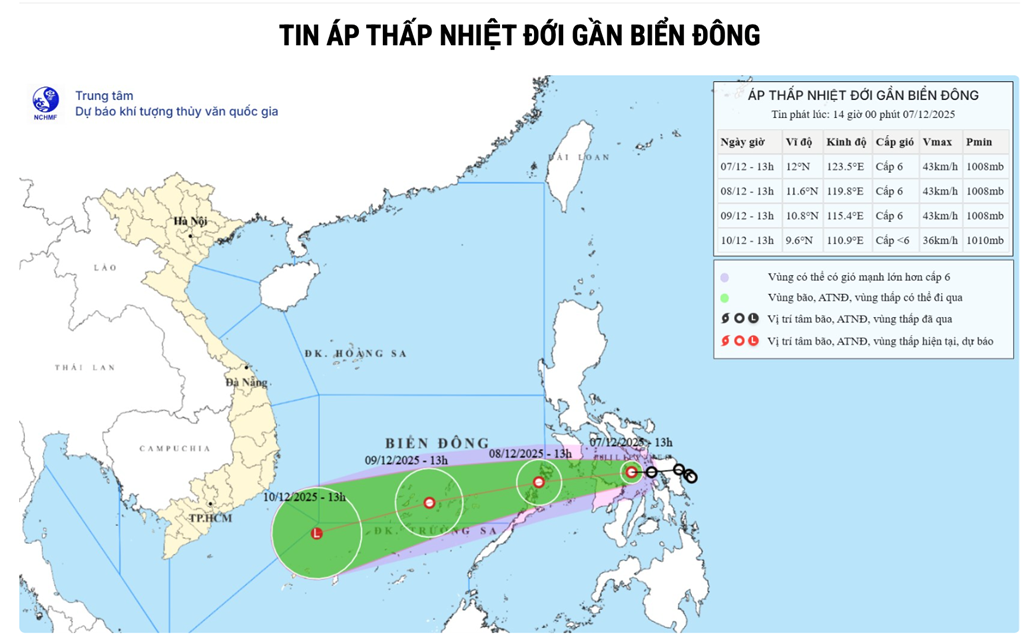 Áp thấp nhiệt đới di chuyển chậm từ Philippines vào Biển Đông, gây gió mạnh cấp 6, giật cấp 8 và sóng cao 2-4m từ ngày 8/12.