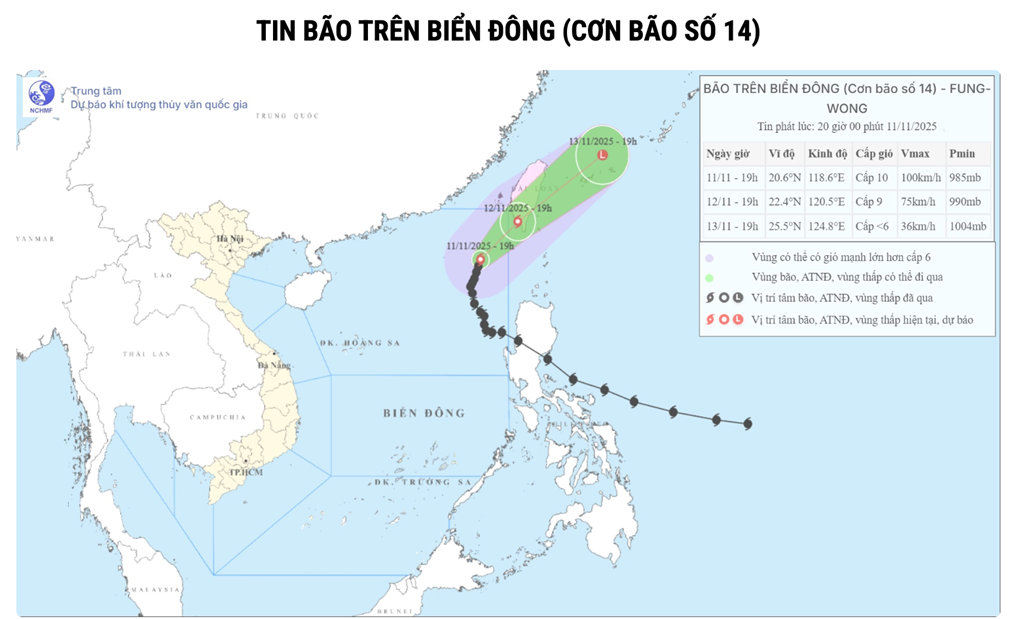 Cập nhật mới nhất đường đi của bão số 14 đến tối 11/11. Ảnh: nchmf.gov.vn