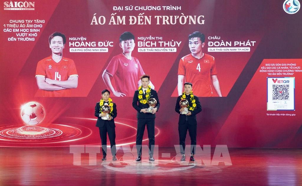 Ba Quả bóng Vàng Việt Nam 2025 đồng thời là Đại sứ chương trình “Áo ấm đến trường”. Ảnh: Trung Tuyến – TTXVN