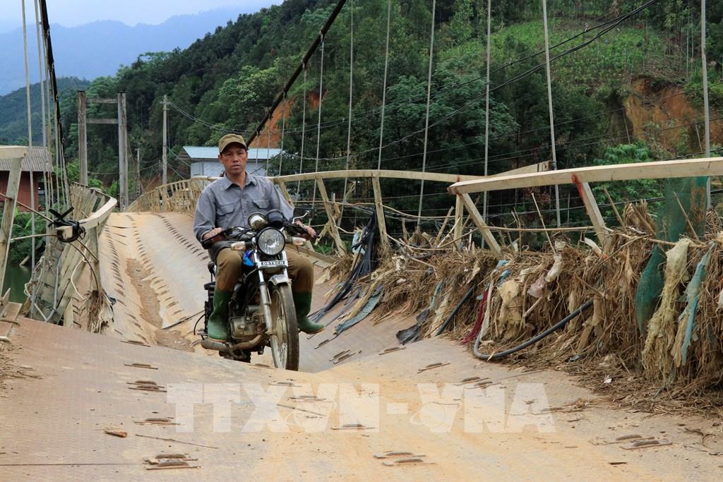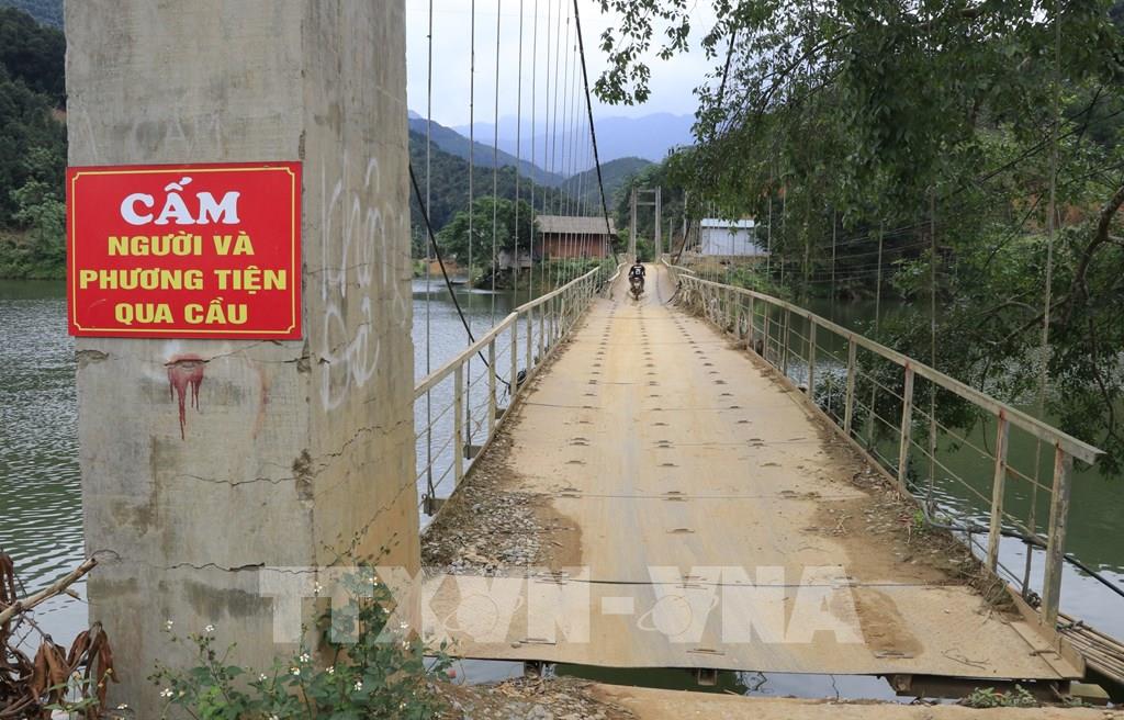 Tuy ý thức rõ ràng sự nguy hiểm, nhưng vì đây là cây cầu độc đạo nên người dân vẫn liều mình hàng ngày đi qua cầu treo này. Ảnh: Anh Thùy - TTXVN