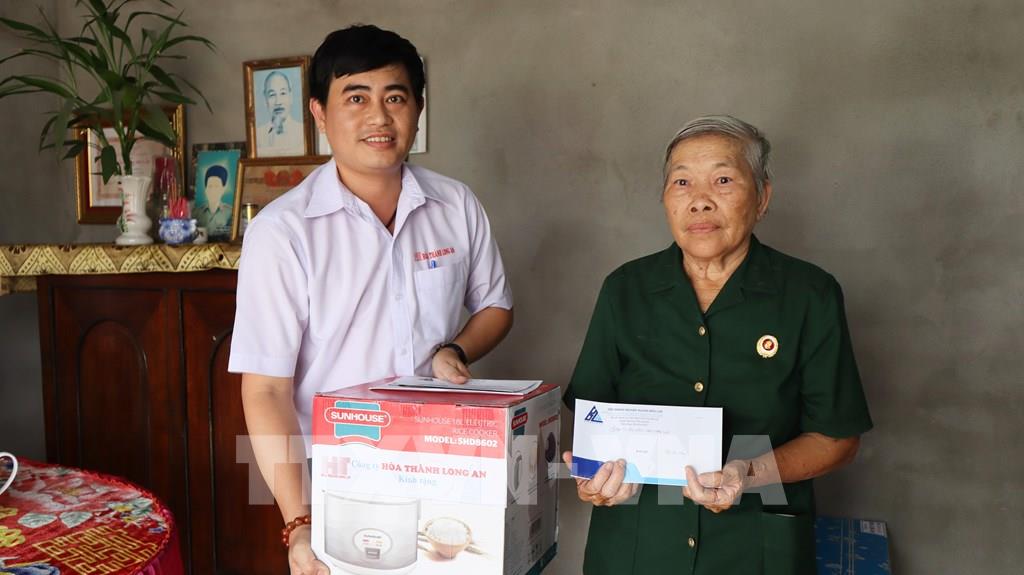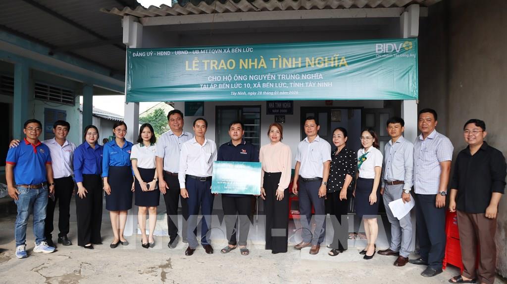 Lãnh đạo xã Bến Lức cùng nhà tài trợ trao nhà tình nghĩa cho hộ anh Nguyễn Trung Nghĩa, cháu của Mẹ Việt Nam anh hùng Mai Thị Tốt. Ảnh: Đức Hạnh - TTXVN