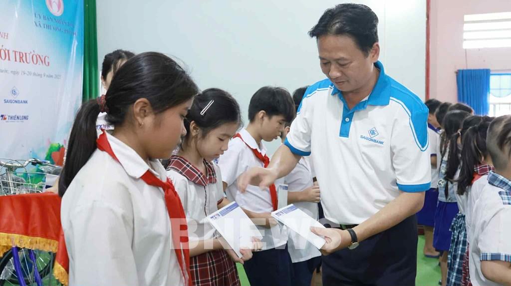 Đại diện Ngân hàng Saigonbank trao học bổng và xe đạp cho các em học sinh tại xã Thường Phước, tỉnh Đồng Tháp. Ảnh: Quang Châu/TTXVN