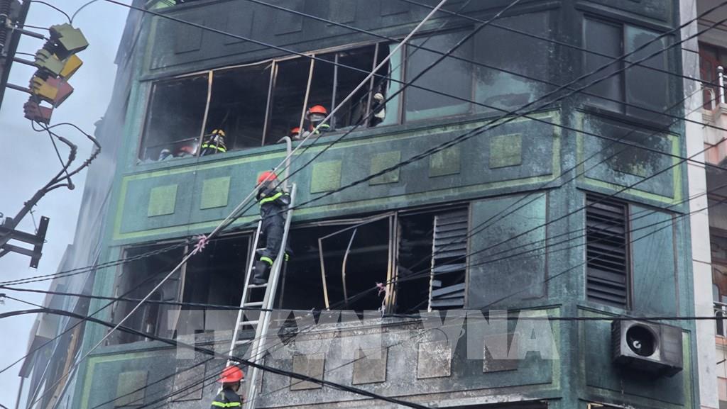 Lực lượng chưc năng xử lý hiện trường vụ cháy. Ảnh Đặng Tuấn TTXVN
