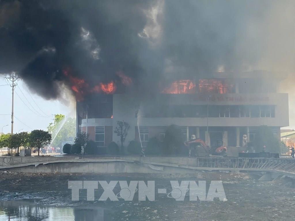 Ngọn lửa bắt đầu từ tầng 3 của Công ty TNHH Chế biến gỗ và thương mại Hào Quang (phường Thành Sen, Hà Tĩnh) và cháy lan sang các khu vực khác. Ảnh: Hoàng Ngà - TTXVN