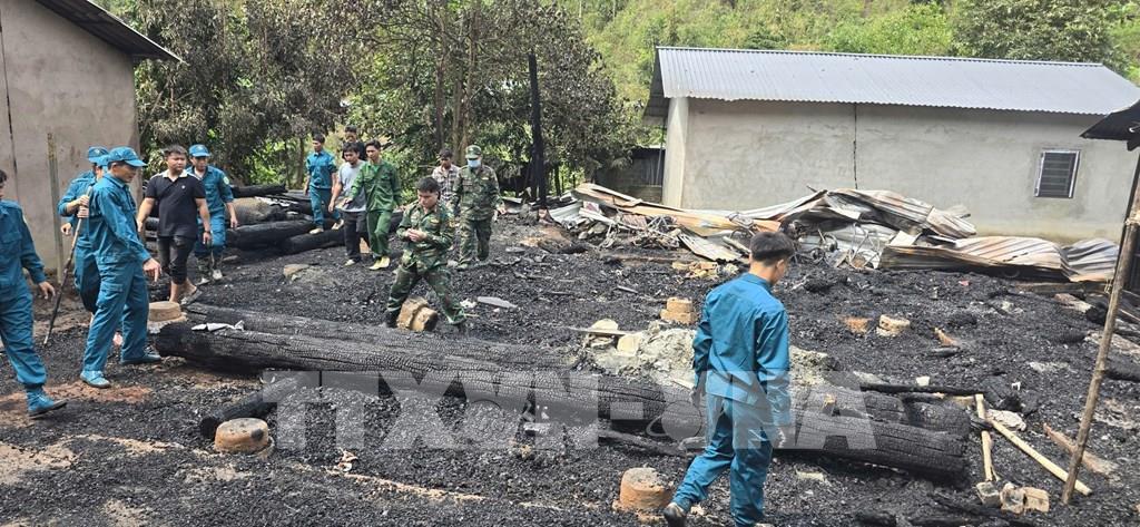 Hiện trường vụ cháy tại một ngôi nhà ở bản Pá Đởn, xã Lê Lợi khiến 3 chị em trong gia đình tử vong. Ảnh: TTXVN phát