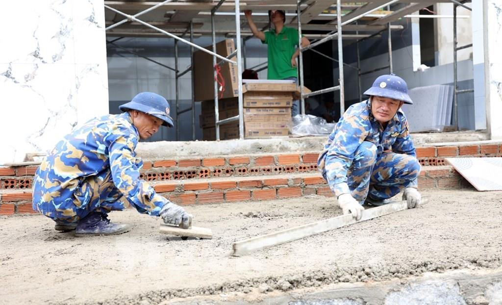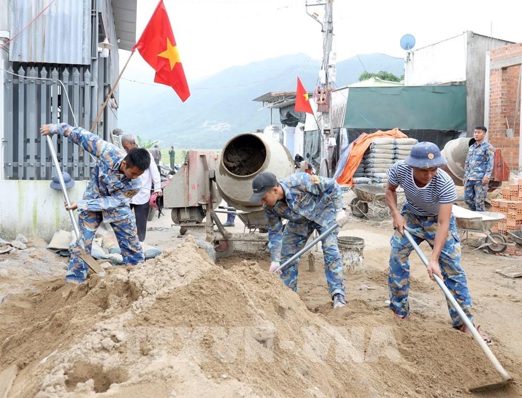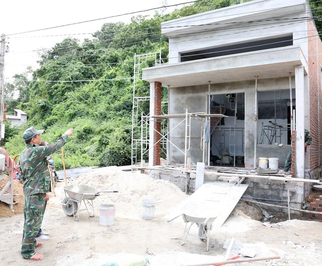 Những phần việc cuối cùng khi xây dựng nhà của chị Trần Thị Mỹ Châu (xã Suối Hiệp, tỉnh Khánh Hòa) được cán bộ, chiến sĩ Lữ đoàn 162 (Vùng 4 Hải Quân) gấp rút hoàn thiện. Ảnh: Xuân Triệu - TTXVN