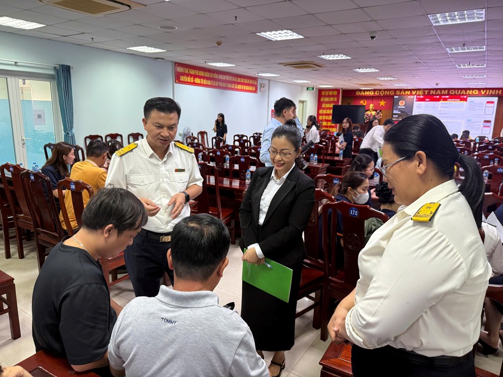Lãnh đạo Thuế TP. Hồ Chí Minh trao đổi, làm rõ các câu hỏi của hộ kinh doanh liên quan đến phương thức quản lý thuế theo hình thức kê khai. Ảnh: Hứa Chung-TTXVN
