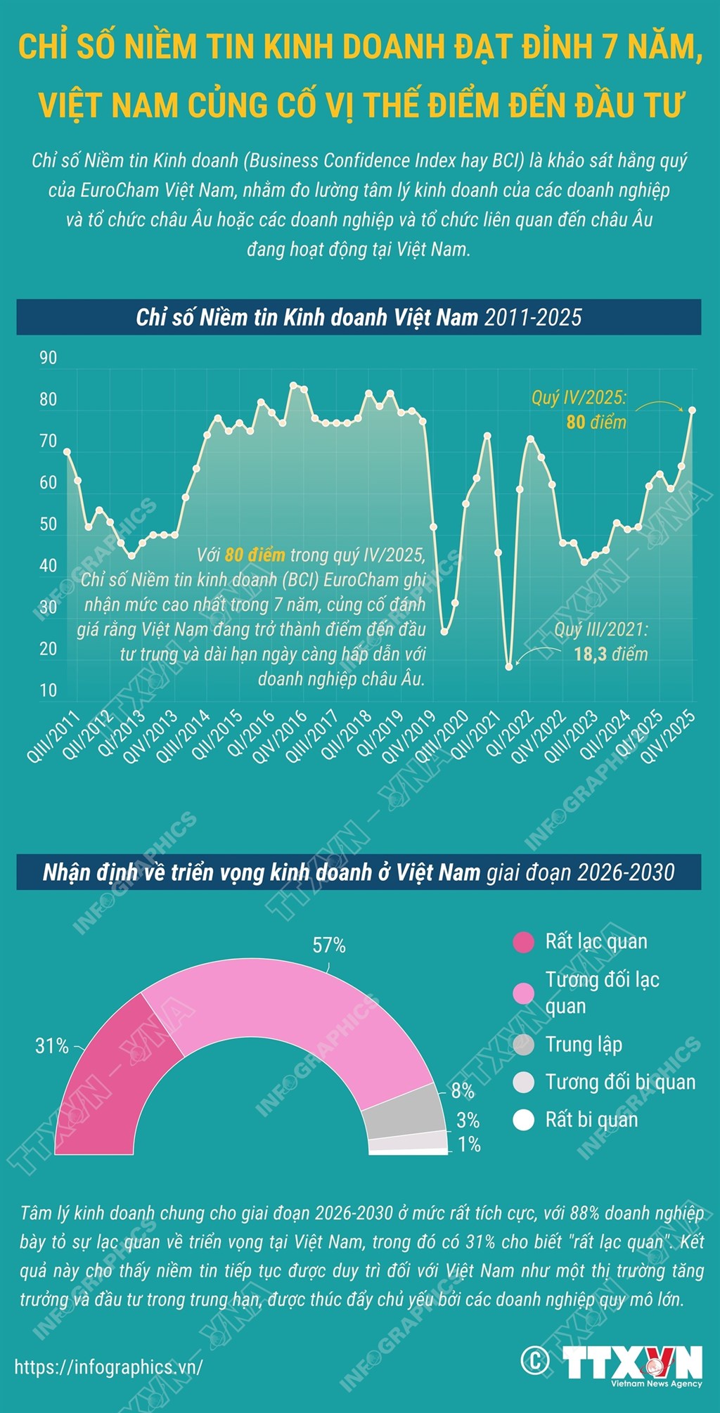 Chỉ số Niềm tin kinh doanh đạt đỉnh 7 năm, Việt Nam củng cố vị thế điểm đến đầu tư. Ảnh: Infograhics.vn