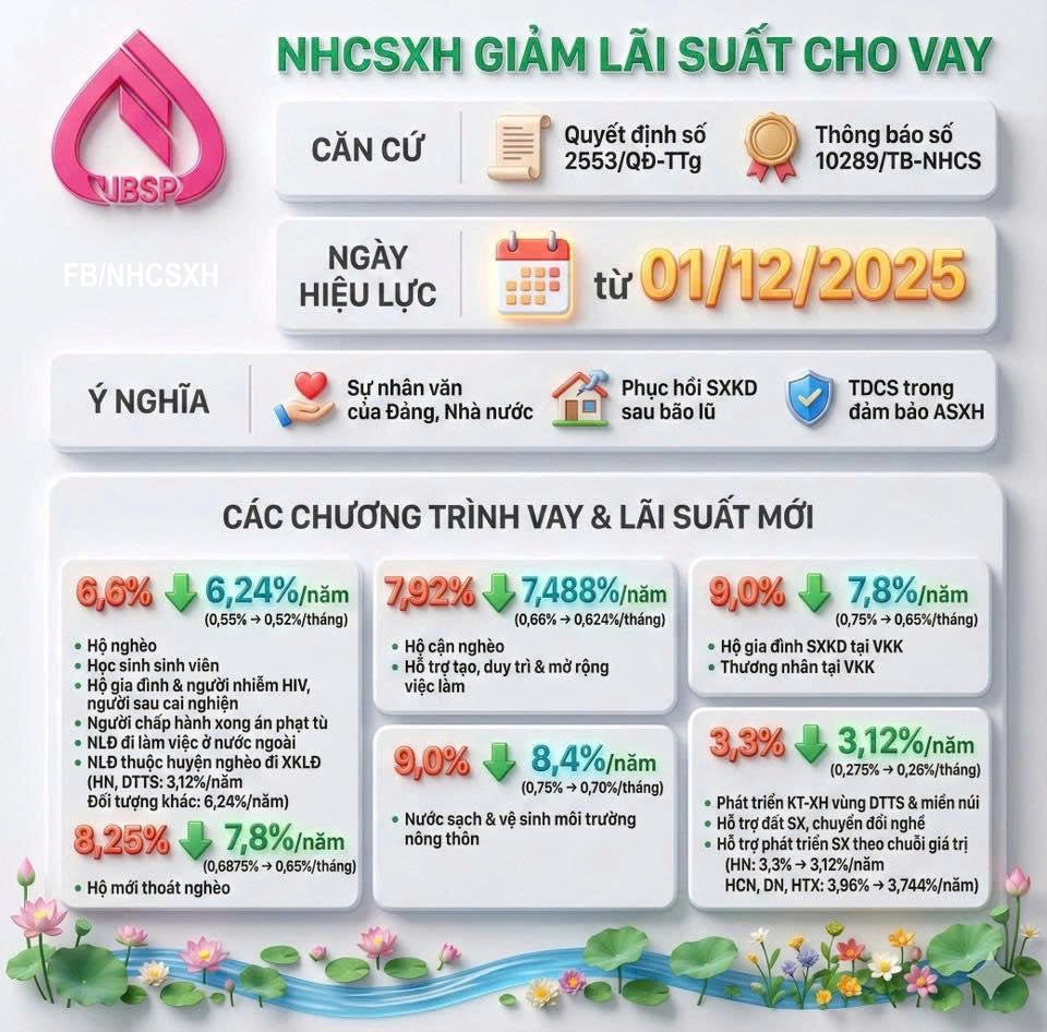 Thực hiện Quyết định số 2553/QĐ-TTg ngày 21 tháng 11 năm 2025 của Thủ tướng Chính phủ về việc điều chỉnh giảm lãi suất cho vay một số chương trình tín dụng chính sách tại Ngân hàng Chính sách xã hội (NHCSXH), Tổng Giám đốc NHCSXH thông báo lãi suất cho vay chương trình hộ nghèo và một số chương trình tín dụng chính sách đang được NHCSXH triển khai như sau: