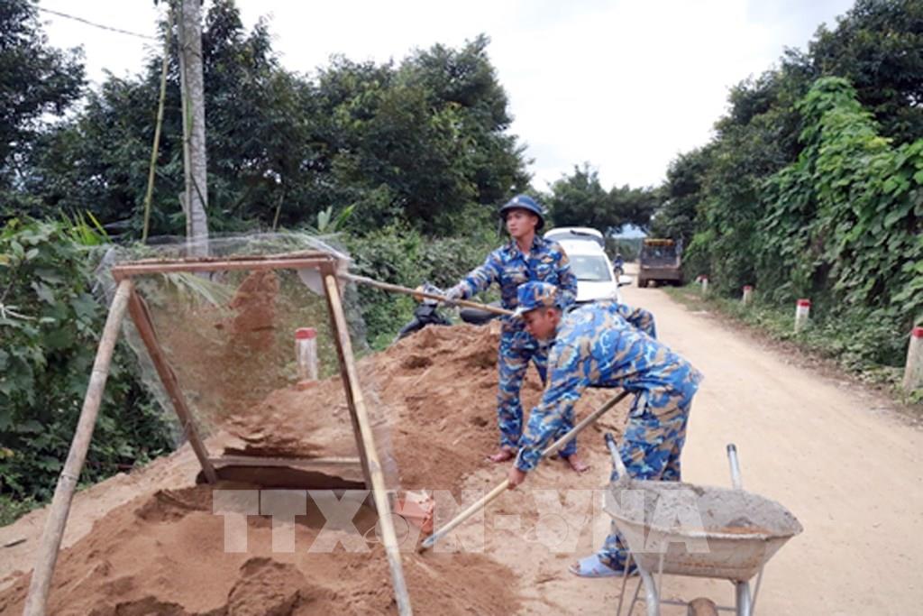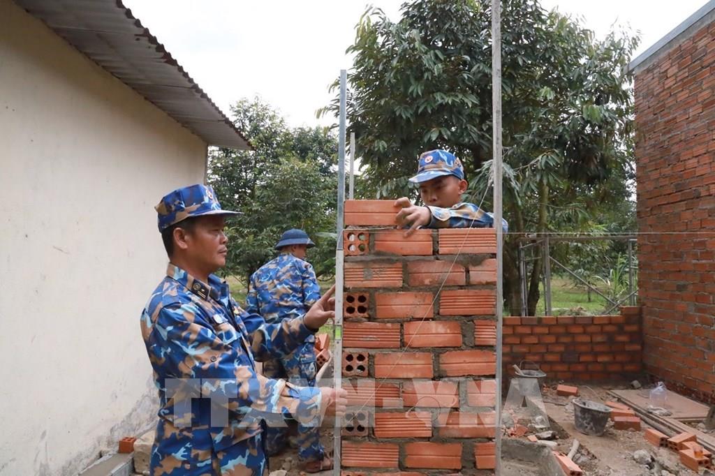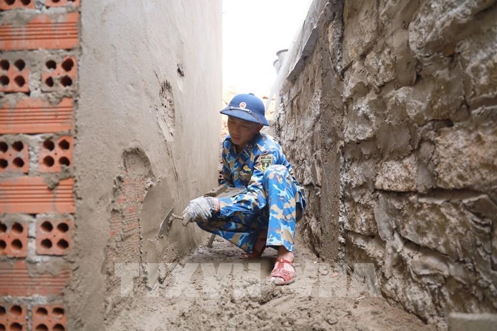 Cán bộ, chiến sĩ Lữ đoàn 101, Vùng 4 Hải quân, xây dựng nhà mới cho gia đình anh Phạm Ngọc Bình (xã Tây Khánh Sơn). Ảnh: Xuân Triệu - TTXVN