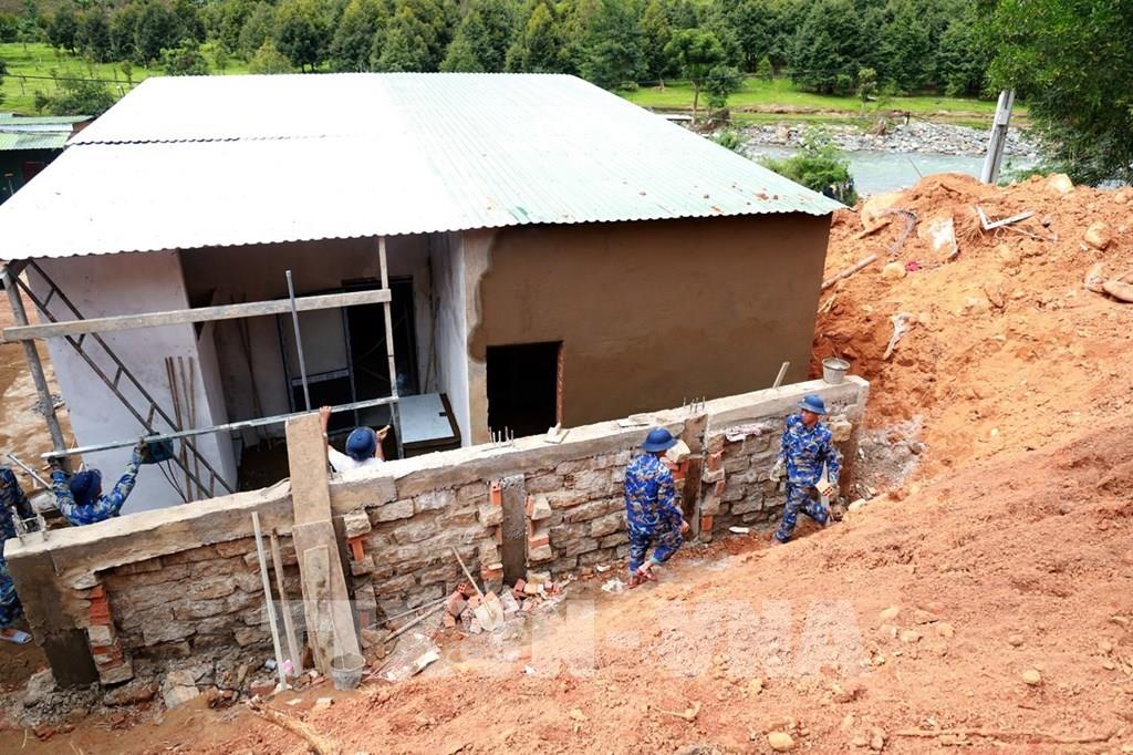 Cán bộ, chiến sĩ Lữ đoàn 101, Vùng 4 Hải quân, dựng thêm bức tường chắn sạt lở đất kiên cố cho gia đình ông Cao Cà Yên (xã Tây Khánh Sơn). Ảnh: Xuân Triệu - TTXVN