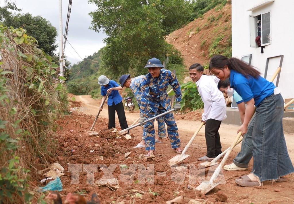 Bộ đội cùng đoàn viên thanh niên và gia đình ông Cao Cà Yên dọn dẹp chuẩn bị khánh thành nhà mới. Ảnh: Xuân Triệu - TTXVN