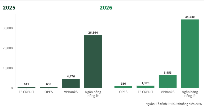 Theo kế hoạch dự kiến trình ĐHĐCĐ thường niên 2026, các trụ cột trong hệ sinh thái VPBank tiếp tục được kỳ vọng đóng vai trò dẫn dắt tăng trưởng. VPBankS dự kiến là đơn vị đóng góp lớn nhất với mục tiêu lợi nhuận năm nay đạt 6.453 tỷ đồng (tăng 44% so với thực hiện năm 2025), trong khi FE CREDIT đặt kế hoạch 1.179 tỷ đồng (tăng 93%), phản ánh kỳ vọng phục hồi mạnh mẽ sau tái cấu trúc. Ở mảng bảo hiểm, OPES cũng hướng tới 936 tỷ đồng lợi nhuận (tăng 47%), duy trì đà tăng trưởng cao.Sự đồng pha trong kế hoạch tăng trưởng của các đơn vị thành viên cho thấy vai trò ngày càng rõ nét của hệ sinh thái trong cơ cấu thu nhập của VPBank. Theo dự báo của nhóm phân tích từ VNDirect, thu nhập ngoài lãi của ngân hàng có thể duy trì mức tăng trên 20% trong năm 2026, chủ yếu nhờ sự cải thiện của nguồn thu phí và hoạt động đầu tư – với động lực chính đến từ VPBankS, OPES và FE CREDIT.