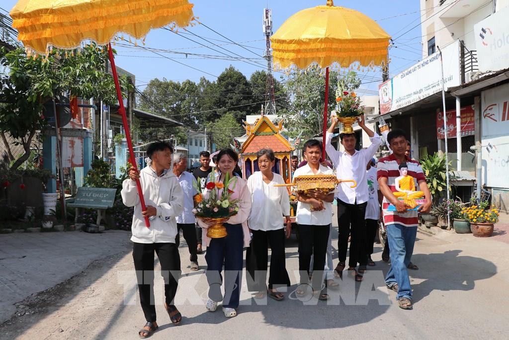 Đồng bào Khmer xã Nhị Trường (Vĩnh Long) tham gia Lễ dâng y Kathina, một trong những nghi lễ truyền thống tiêu biểu của Phật giáo Nam tông Khmer. Ảnh: Thanh Hòa - TTXVN