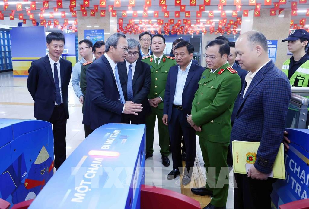 Thượng tướng Nguyễn Văn Long, Thứ trưởng Bộ Công an và các đại biểu trải nghiệm hệ thống soát vé tự động ứng dụng giải pháp sinh trắc học thanh toán không dùng tiền mặt trên tuyến đường sắt đô thị 2A Cát Linh – Hà Đông. Ảnh: Phạm Kiên - TTXVN