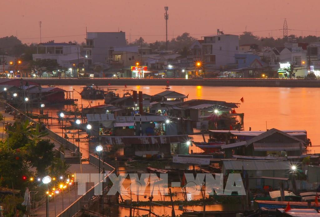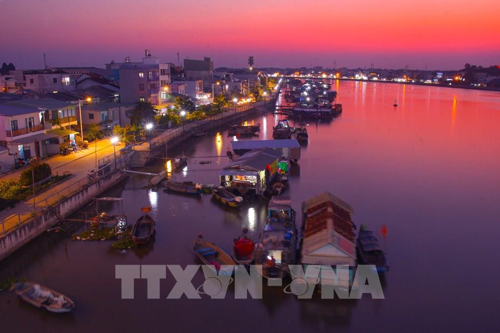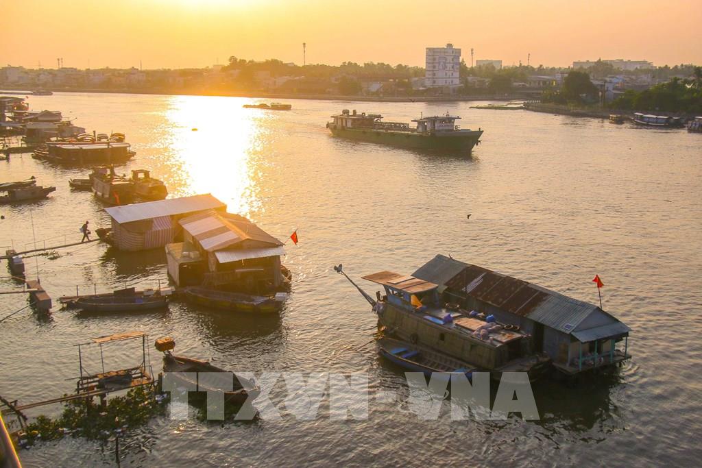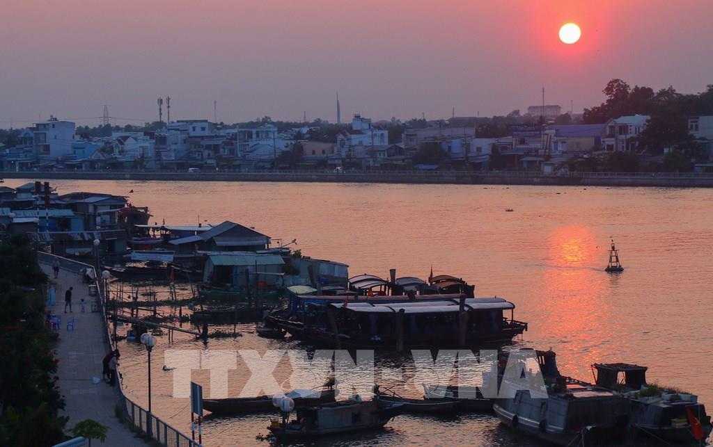 Giữa dòng sông lững lờ, vài chiếc ghe thuyền neo đậu, xuôi ngược mang đặc trưng vùng Nam Bộ. Ảnh: Duy Khương – TTXVN