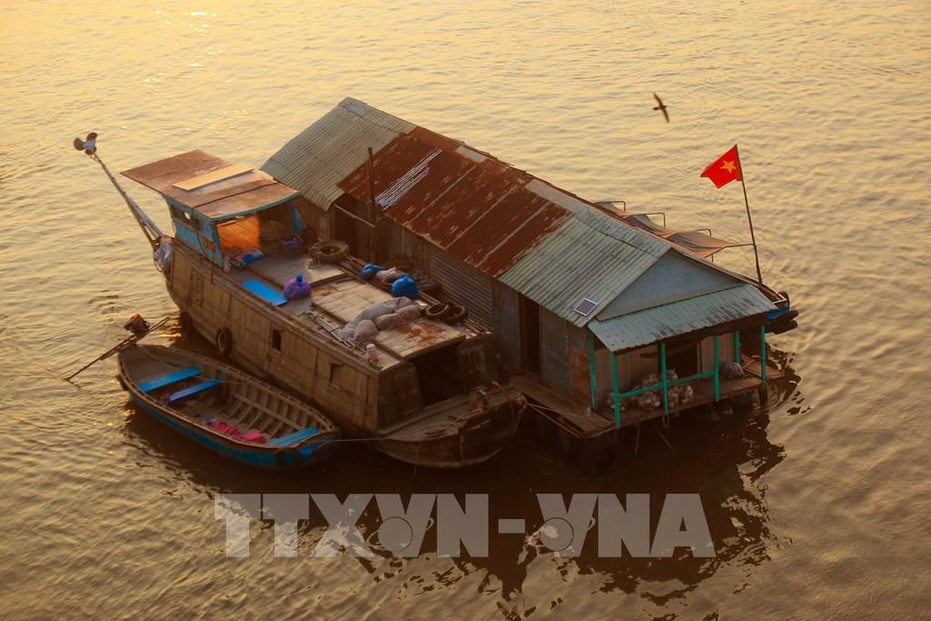 Giữa dòng sông lững lờ, vài chiếc ghe còn neo đậu mang đặc trưng của Nam Bộ. Ảnh: Duy Khương – TTXVN