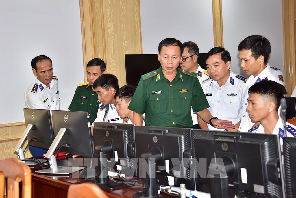 Đoàn Công tác Bộ Quốc phòng kiểm tra tại Trung tâm Chỉ huy Bộ Tư lệnh Vùng Cảnh sát biển 4. Ảnh: TTXVN phát