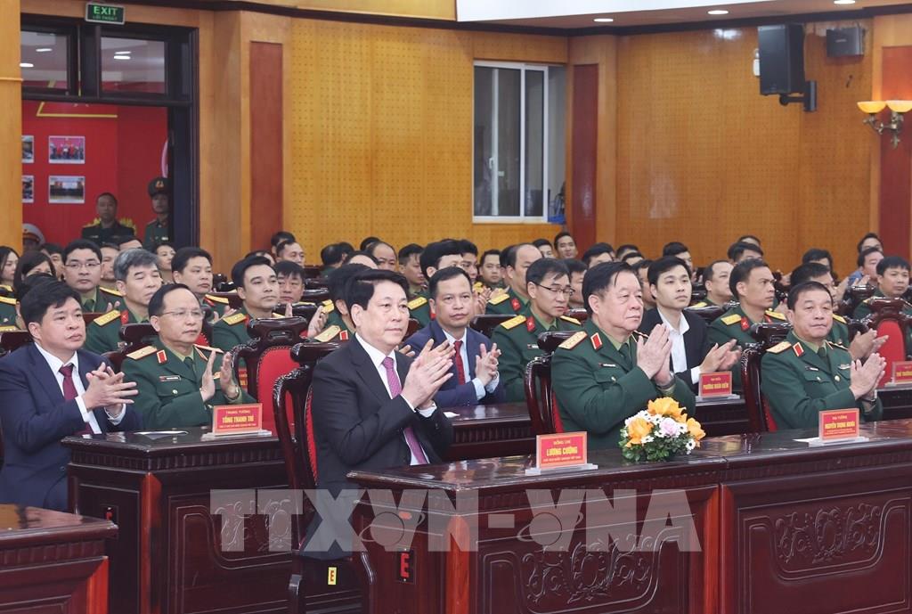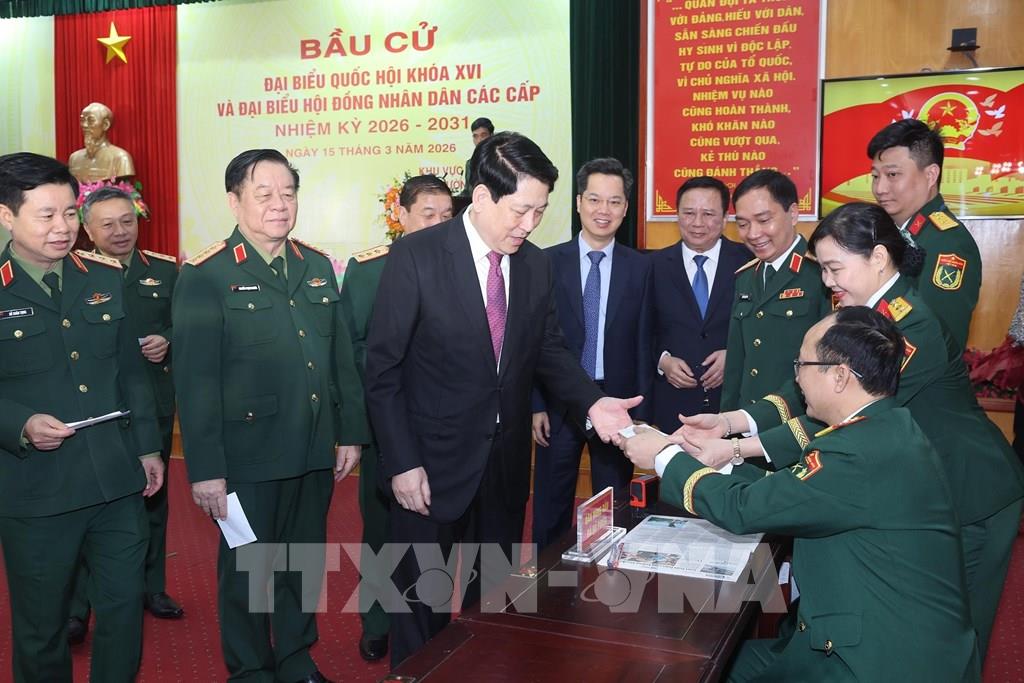 Chủ tịch nước Lương Cường và các cử tri quân đội dự lễ khai mạc bầu cử tại khu vực bỏ phiếu số 26, phường Hoàn Kiếm, thành phố Hà Nội. Ảnh: Lâm Khánh - TTXVN
