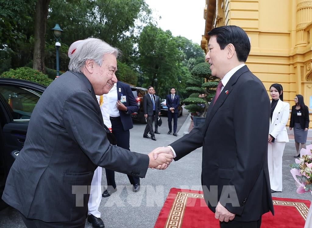 Chủ tịch nước Lương Cường đón Tổng Thư ký Liên hợp quốc António Guterres tại Phủ Chủ tịch. Ảnh: Lâm Khánh - TTXVN