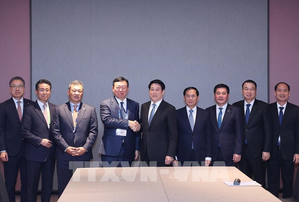 Chủ tịch nước Lương Cường với Chủ tịch Tập đoàn Lotte Shin Dong-bin và các đại biểu. Ảnh: Lâm Khánh – TTXVN