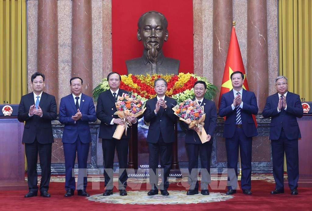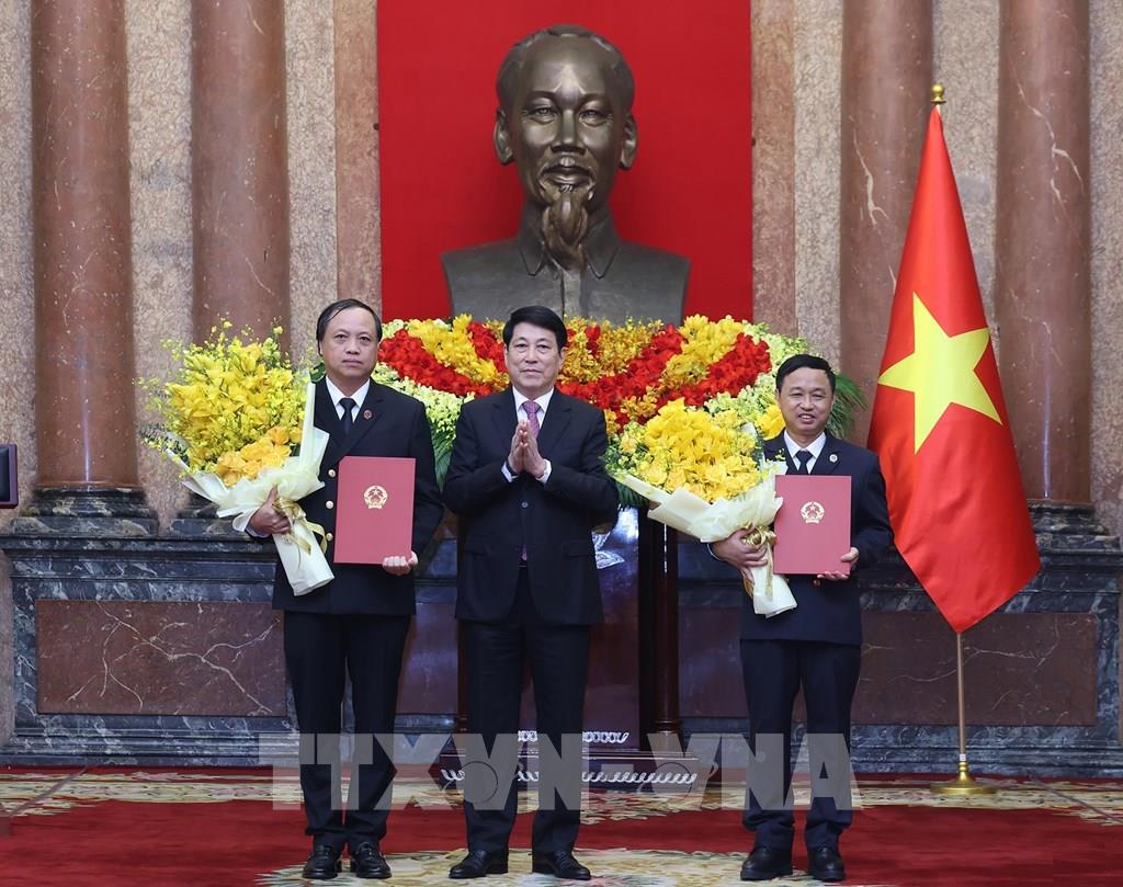 Chủ tịch nước Lương Cường trao quyết định bổ nhiệm Phó Chánh án Toà án nhân dân tối cao đối với hai đồng chí Lê Tiến và Nguyễn Biên Thuỳ. Ảnh: Lâm Khánh - TTXVN