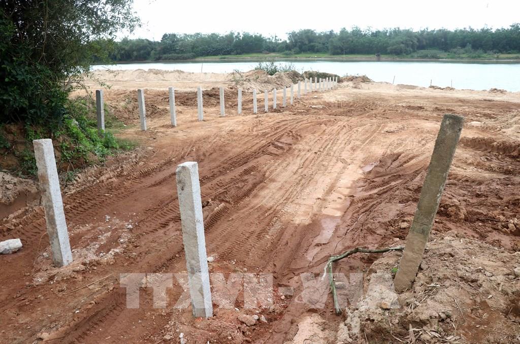Lối vào bãi cát sỏi trái phép đã được chính quyền thị trấn Ái Tử, huyện Triệu Phong, tỉnh Quảng Trị rào bằng trụ bê tông. Ảnh: Nguyên Lý-TTXVN