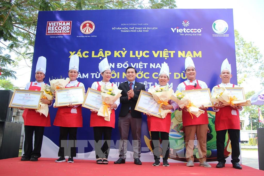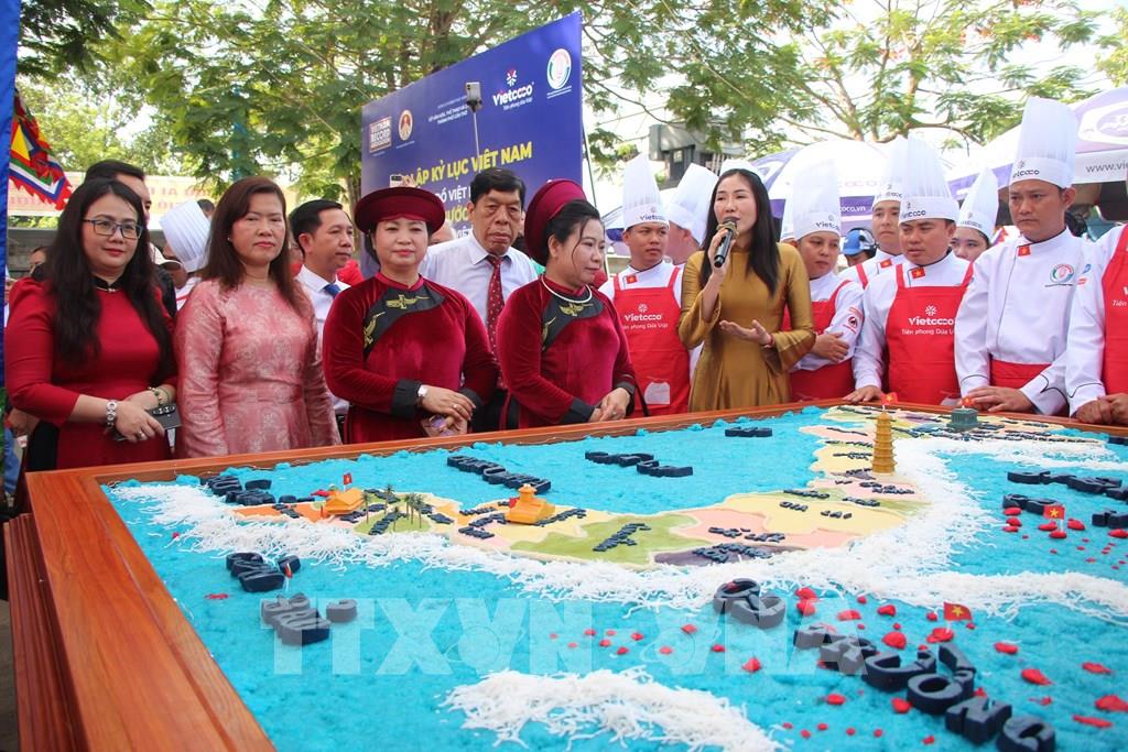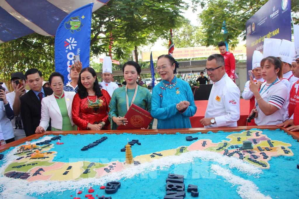 Đơn vị chuyên môn thẩm định, kiểm tra để công nhận Kỷ lục Việt Nam với nội dung " Sự kiện chế biến và công diễn Bản đồ Việt Nam làm từ xôi nước cốt dừa lớn nhất Việt Nam". Ảnh: Nguyễn Hằng - TTXVN