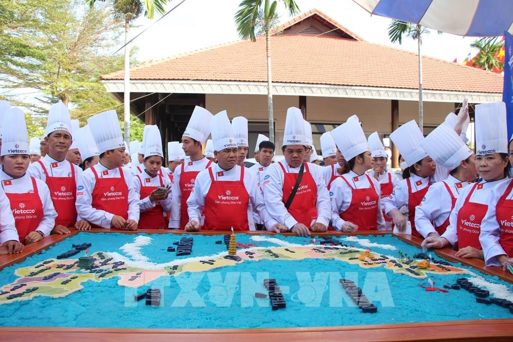 103 nghệ nhân, đầu bếp chuyên nghiệp cùng tham gia chế tác Bản đồ Việt Nam làm từ xôi nước cốt dừa lớn nhất. Ảnh: Nguyễn Hằng - TTXVN