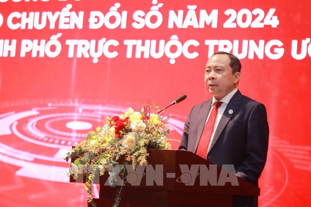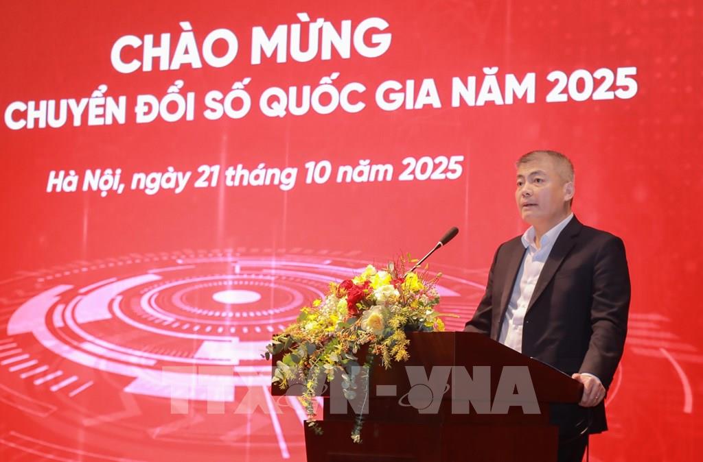 Ông Ngô Diên Hy, Phó Tổng Giám đốc Tập đoàn Bưu chính Viễn thông Việt Nam (VNPT) đưa ra các giải pháp chuyển đổi số lấy người dân làm trung tâm trong mô hình chuyển đổi số 2 cấp. Ảnh: Phan Phương - TTXVN