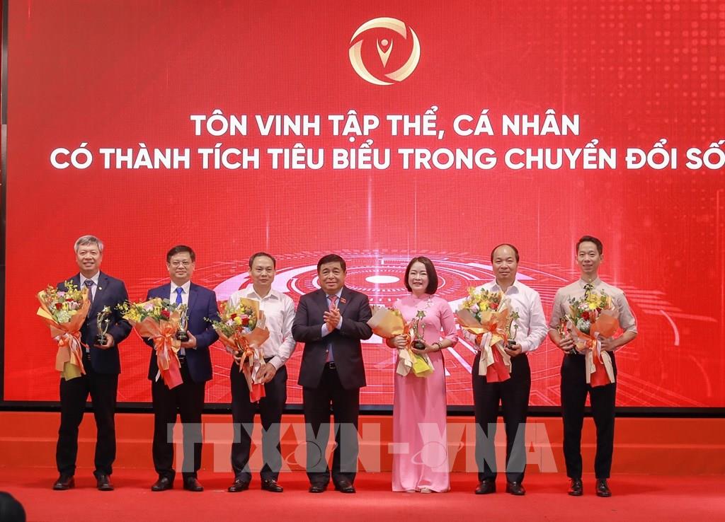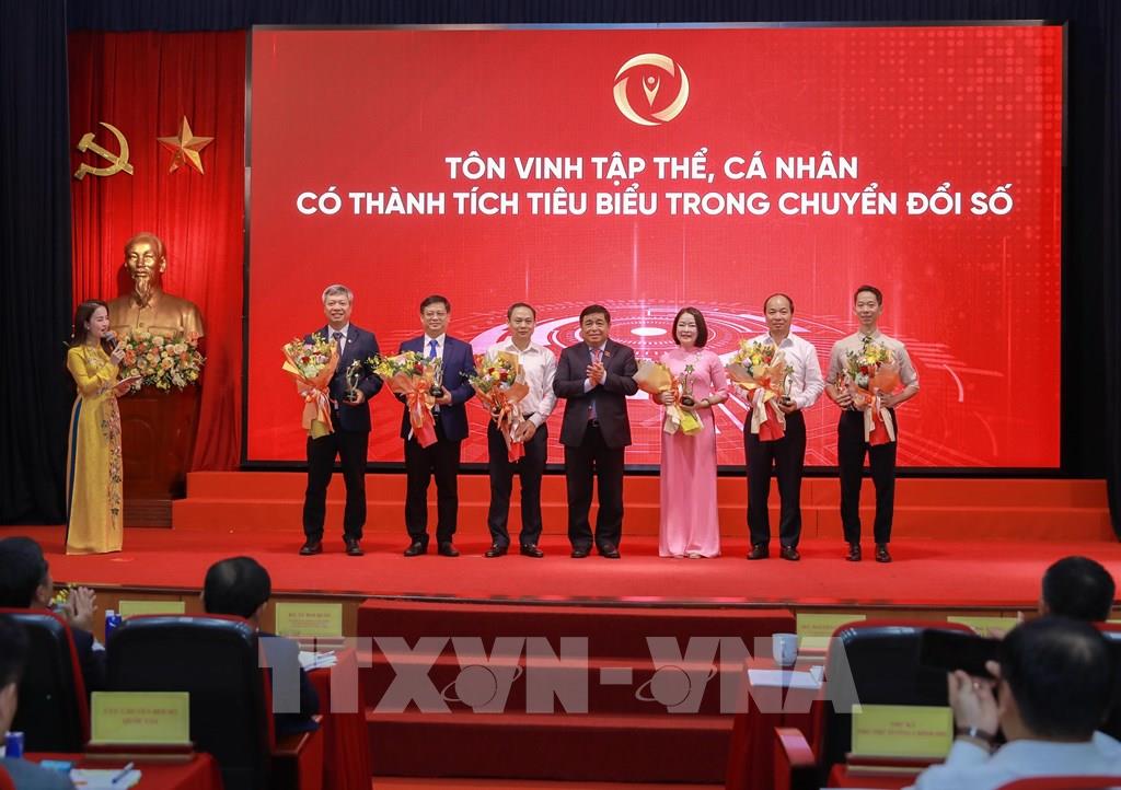 Phó Thủ tướng Chính phủ Nguyễn Chí Dũng tặng hoa và kỷ niệm chương cho tập thể, cá nhân có thành tích tiêu biểu trong chuyển đổi số. Ảnh: Phan Phương - TTXVN