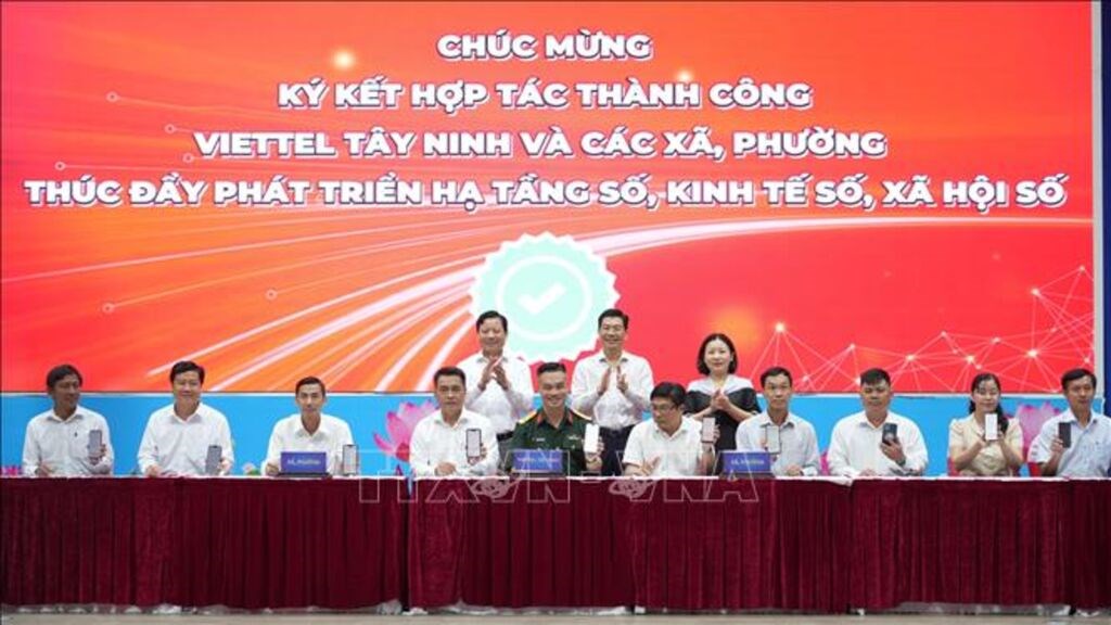 Viettel Tây Ninh và đại diện 34 xã, phường trên địa bàn tỉnh Tây Ninh ký kết hợp tác chuyển đổi số. Ảnh: Minh Phú - TTXVN