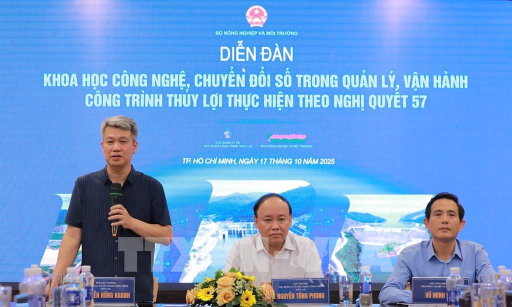 Lãnh đạo Cục Quản lý và Xây dựng công trình thủy lợi (Bộ Nông nghiệp và Môi trường) và Báo Nông nghiệp và Môi trường chủ trì diễn đàn. Ảnh: Xuân Anh -TTXVN