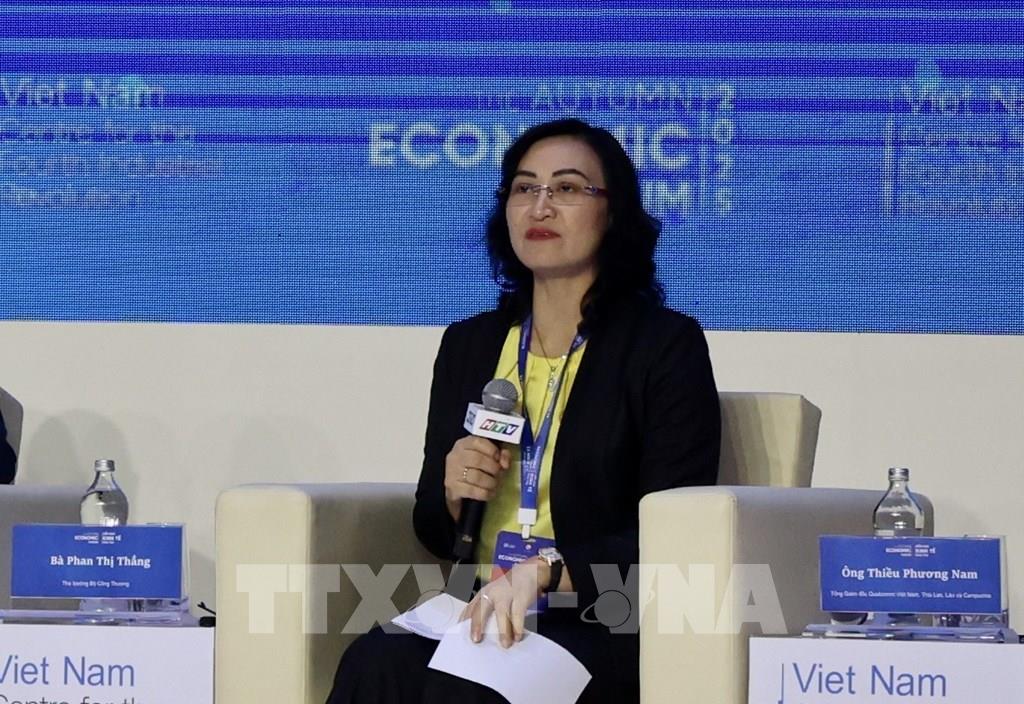 Bà Phan Thị Thắng, Thứ trưởng Bộ Công Thương thông tin chính sách chuyển đổi năng lượng bền vững tại phiên đối thoại. Ảnh: Xuân Anh -TTXVN
