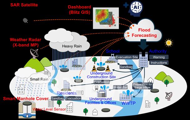 Một ví dụ tiêu biểu cho các giải pháp phi công trình là hệ thống dự báo ngập lụt sử dụng trí tuệ nhân tạo (AI). Hệ thống này sử dụng dữ liệu từ thiết bị cảm biến mực nước, lắp đặt trong các đường ống cống thoát nước, hệ thống quan sát radar thời tiết và dữ liệu từ mạng lưới sông ngòi và cống thoát nước để phân tích và dự đoán khu vực có nguy cơ ngập. Nhiều địa phương tại Nhật Bản đã triển khai hệ thống này, dùng để cung cấp thông tin cho người dân, trường học, đơn vị quản lý hạ tầng. Ngoài ra, dữ liệu thu được còn dùng để thiết lập các yếu tố kích hoạt cho các hoạt động kiểm soát lũ lụt và hành động sơ tán.