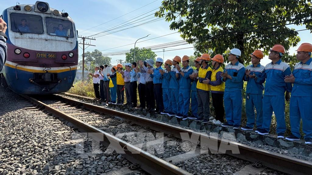 Lúc 9 giờ ngày 11/3/2026, đoàn tàu số hiệu đầu máy D19E-966, với tải trọng khoảng 1.000 tấn lưu thông qua cầu Ghềnh, sau 6 ngày bị gián đoạn do sự cố sà lan đâm va gây hư hỏng. Ảnh: Sỹ Tuyên - TTXVN