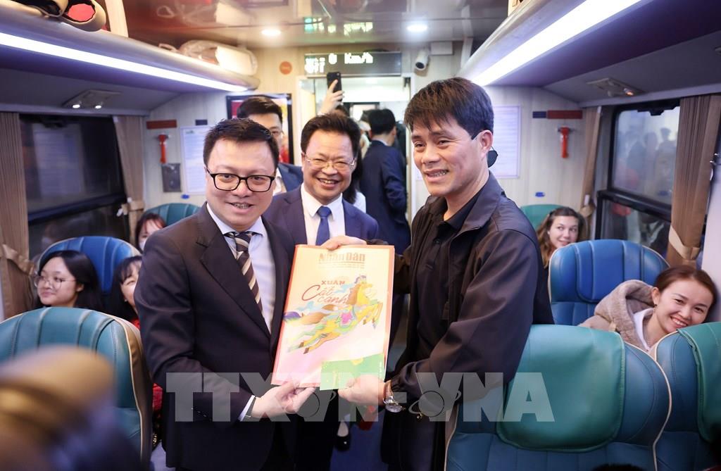 Tổng biên tập Báo Nhân Dân Lê Quốc Minh tặng ấn phẩm báo Nhân Dân cho hành khách trên tàu. Ảnh: Quốc Khánh - TTXVN